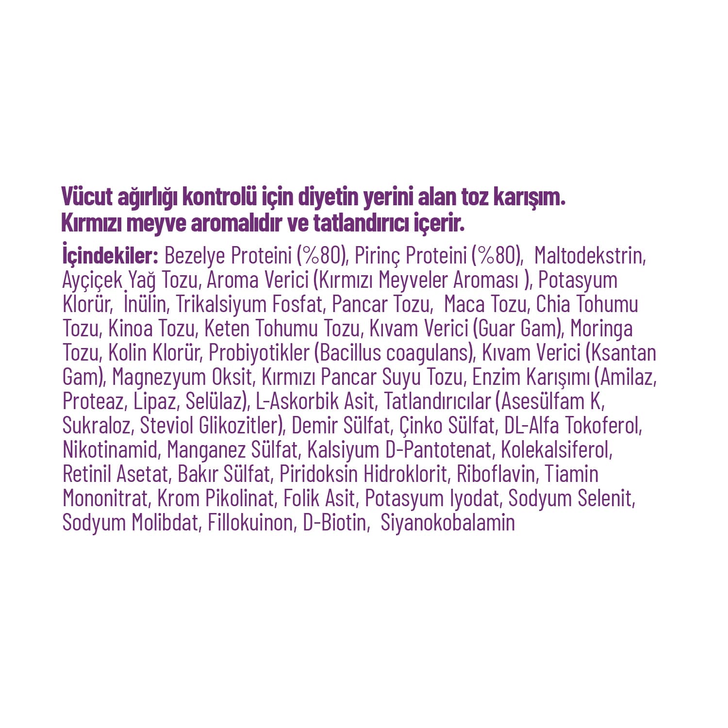 Bilgilendirme Notu: Bu ürün hakkında verilen bilgiler yalnızca genel bilgilendirme amacı taşımaktadır; kullanım önerisi veya tıbbi tavsiye yerine geçmez. Ürün hakkındaki yorumlar, kullanıcıların kendi deneyimlerini paylaşabilecekleri bir alan olup, sadece yayınlama ilkelerine uygun olanlar paylaşılacaktır. Bu ürün bir beslenme destek ürünüdür, ilaç değildir ve herhangi bir hastalığın tedavisi amacıyla kullanılmamalıdır. Kullanım sırasında yeterli miktarda sıvı tüketilmesi önerilir. Dengeli ve çeşitli bir beslenmenin parçası olarak tüketilmelidir; tek başına günlük besin ihtiyacını karşılamaz. Tatlandırıcı içerebilir. 18 yaş altı bireyler ve hamile kadınlar, yalnızca doktor veya diyetisyen onayıyla kullanmalıdır. Ürünü serin, kuru ve doğrudan güneş ışığından uzak bir yerde muhafaza ediniz. Son kullanma tarihi ve parti numarası ambalaj üzerinde belirtilmiştir. Tavsiye edilen günlük miktarın üzerine çıkmayınız. Çocukların erişemeyeceği yerlerde saklayınız.