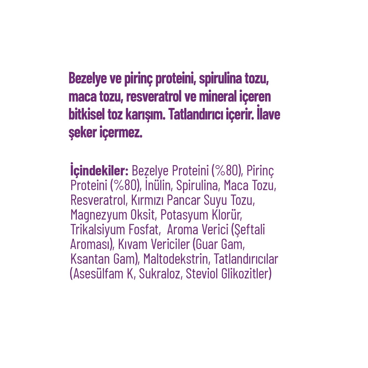 Tek bir porsiyonda (30 gram) 20 gram bitkisel protein sunar ve tam aminoasit profili sağlar. Porsiyon başına sadece 110 kalori ile yüksek protein desteği sağlar ve minimal karbonhidrat-şeker içerir. Spirulina, maca tozu ve resveratrol gibi süper gıdalarla zenginleştirilmiştir.